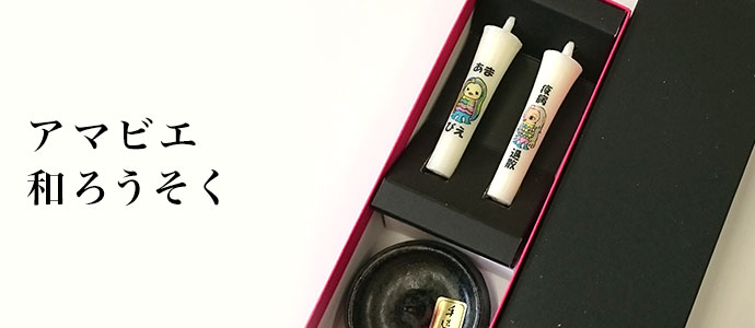 疫病を封じ込める妖怪アマビエの絵ろうそと燭台のセット。ご贈答用としても喜ばれています。